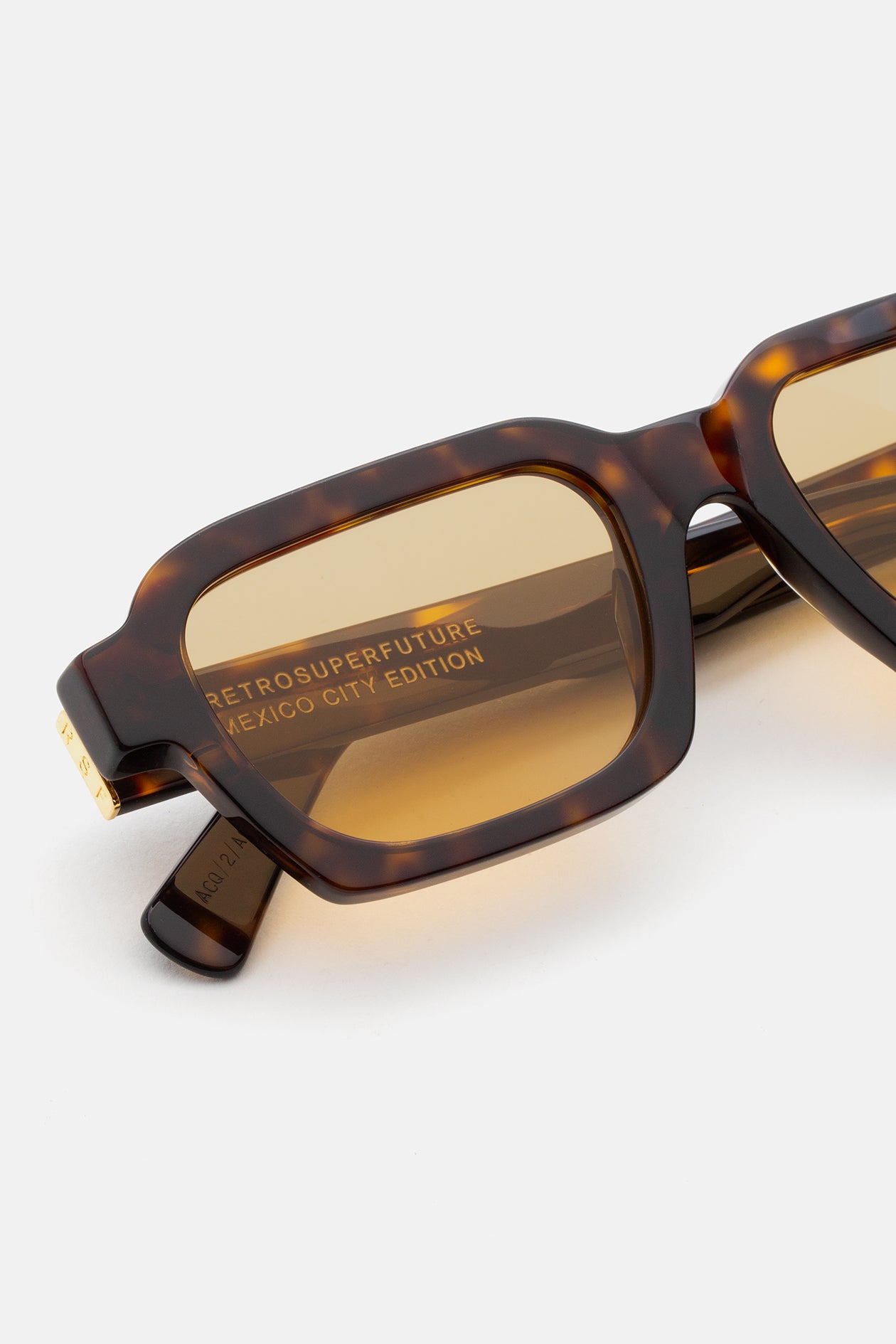 Diseñado para la apertura de la tienda de RSF Ciudad de México en una combinación de colores única que celebra los valores vibrantes de la ciudad. Caro es una silueta amplia y geométrica que combina el clasicismo italiano de los años 60 con la estética grunge de los 90. El modelo presenta un diseño redondeado con una estructura de acetato gruesa y resistente, puntas de patillas cuadradas y bordes angulares en la mitad inferior de la montura. Esta versión de Caro viene en acetato Habana oscuro y elegantes lentes color mostaza.