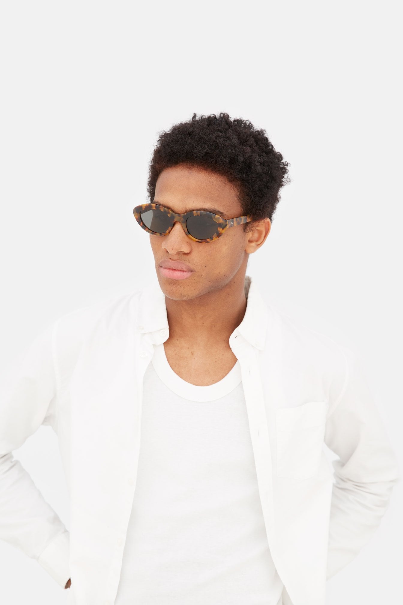 Diseñada para la colección Primavera/Verano 2021, Cocca es una silueta juguetona que se caracteriza por sus gruesas líneas y rasgos curvilíneos. Una nueva interpretación de las monturas vintage de ojo de gato, con una construcción de acetato grueso, puente nasal bajo y lentes anchas. Este modelo se presenta en acetato habano con lentes negras.