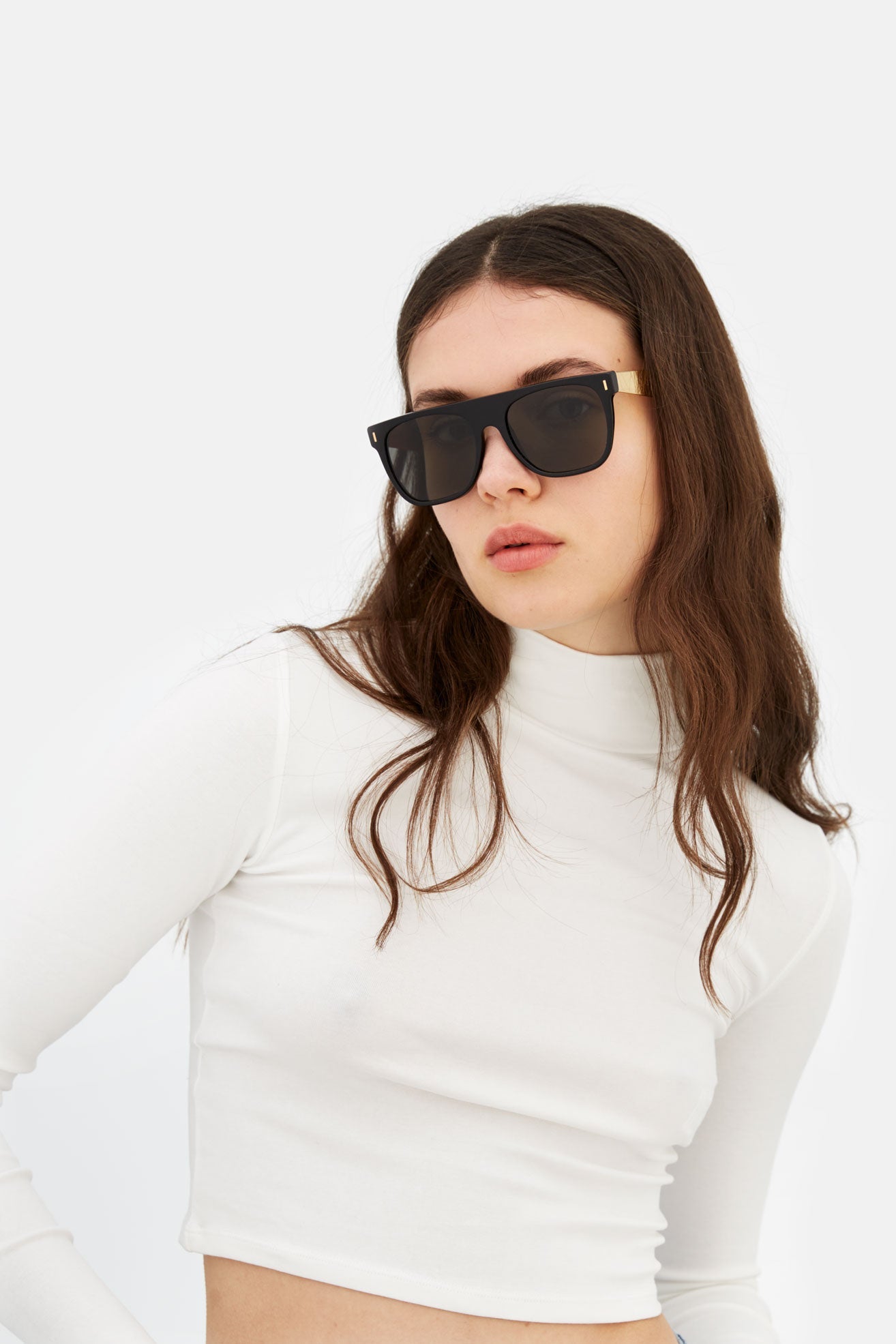 Diez años después de su lanzamiento por primera vez, RSF celebra su icónica serie de gafas Francis.Esta versión del Flat Top se ha actualizado con detalles nítidos para combinar con la sensibilidad estética contemporánea.Las patillas de metal puro y resistente (el rasgo distintivo de Francis) realzan la construcción compacta de acetato del modelo.Este diseño combina acetato negro brillante con metal dorado intenso y brillante.El logotipo X de RSF está inscrito en las patillas, celebrando los 10 años del diseño de Francisco.