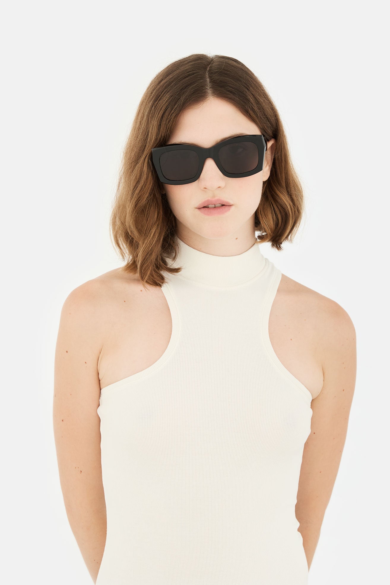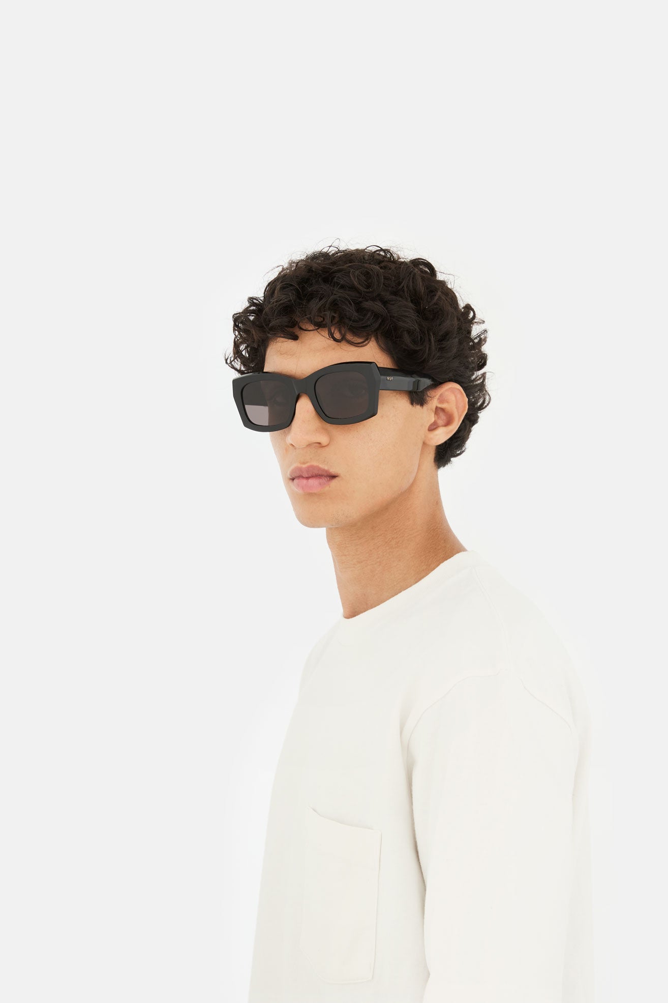 Komori es una montura de acetato robusta y de gran tamaño con un diseño hipergeométrico único que se extiende hasta las patillas. Su atemporal montura de acetato negro brillante se combina con lentes Zeiss negras extra oscuras para crear una prenda versátil y llamativa. Hecho a mano en Italia.