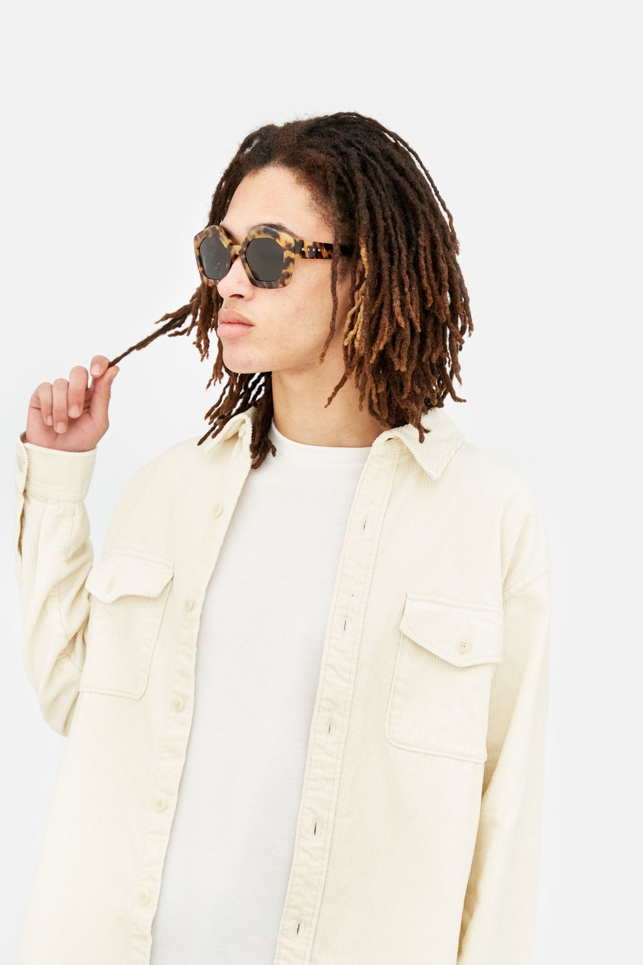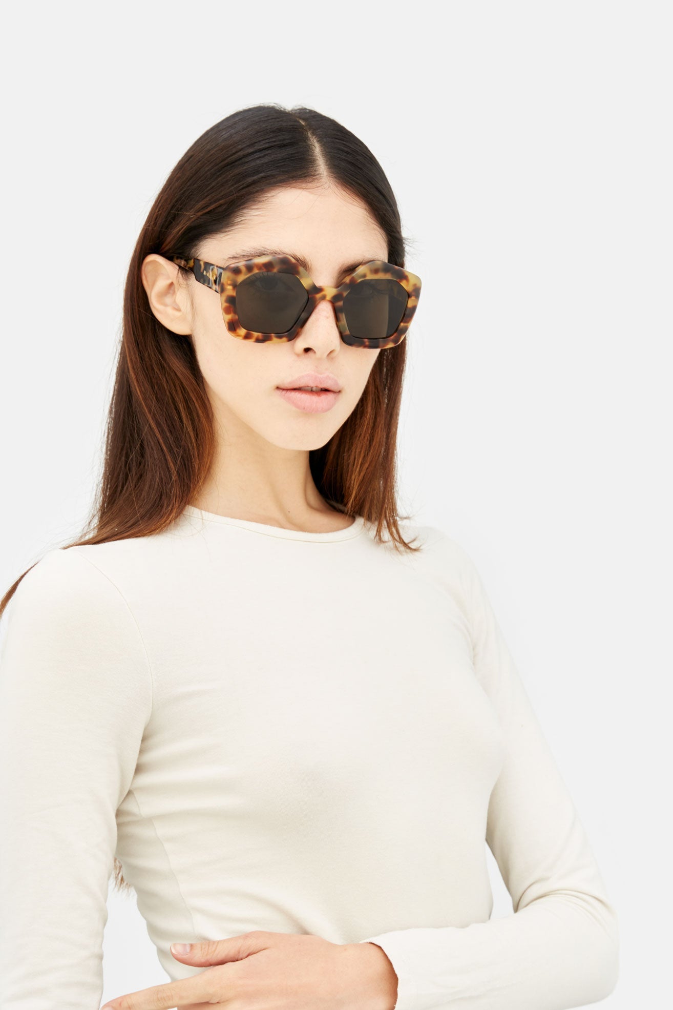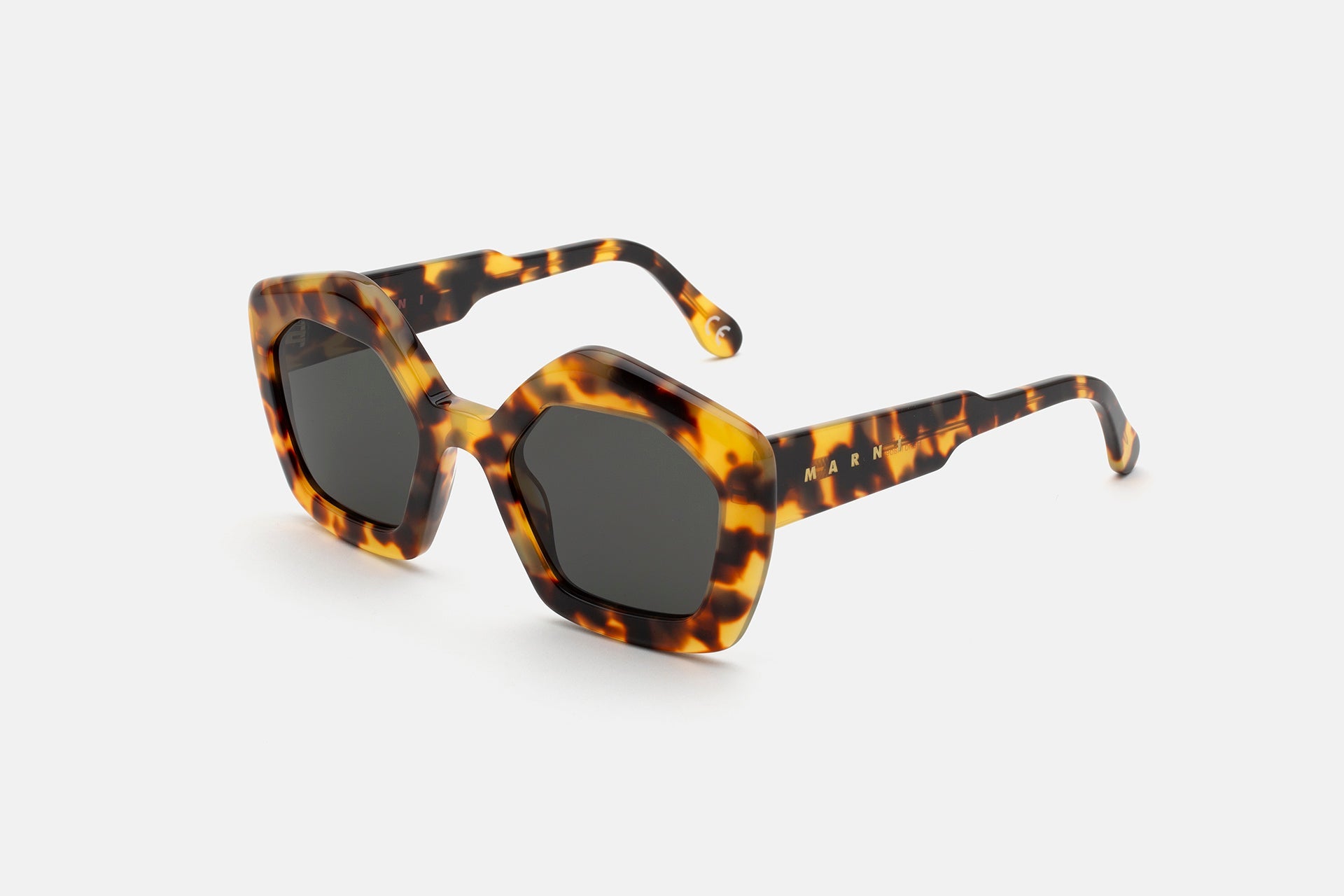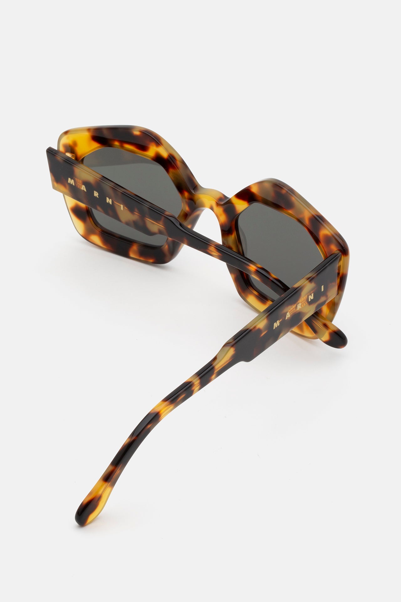 Diseñada en exclusiva para Marni, Laughing Waters es una silueta de acetato grueso caracterizada por lentes de gran tamaño y bordes esculpidos. La icónica forma pentagonal de las lentes es una reinterpretación de la silueta tradicional de Marni. Esta versión viene con lentes negras y un vibrante acetato habano con la marca Marni en las patillas.