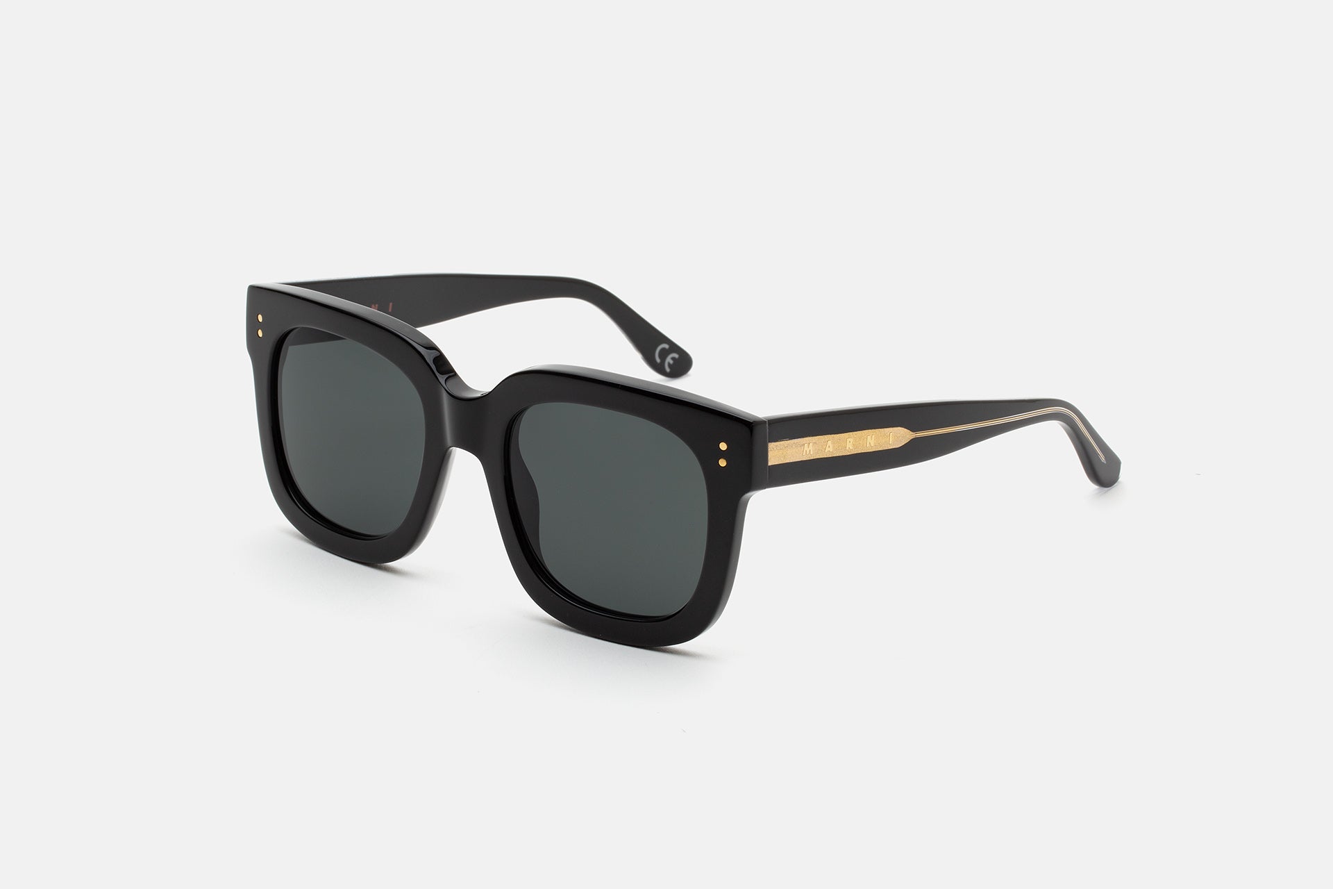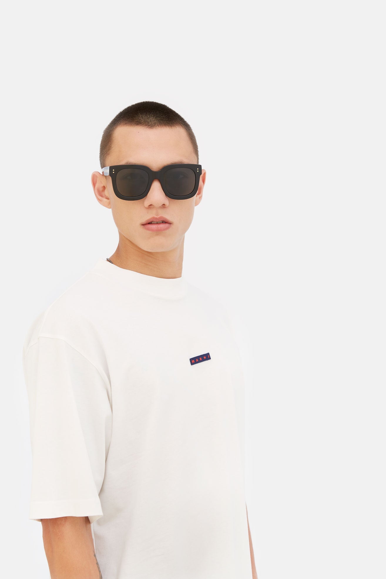 Diseñada en exclusiva para Marni, Li River es una silueta icónica de gran tamaño fabricada en acetato italiano de calidad. Su forma se caracteriza por unos atrevidos cristales cuadrados con terminales geométricos. El frontal presenta una línea grabada que marca los gruesos bordes de la forma. Esta versión es de acetato negro con grabado blanco y cristales negros.