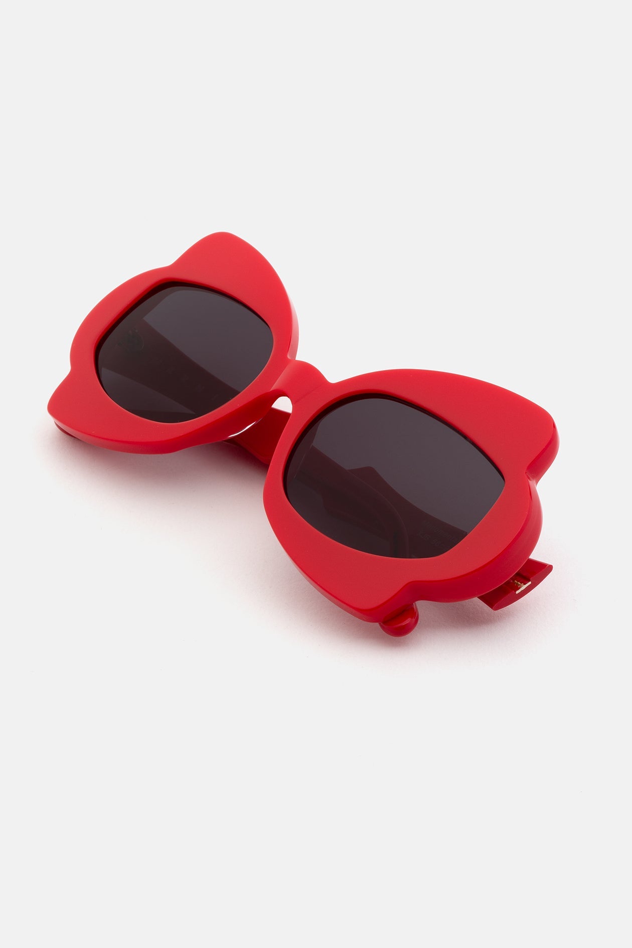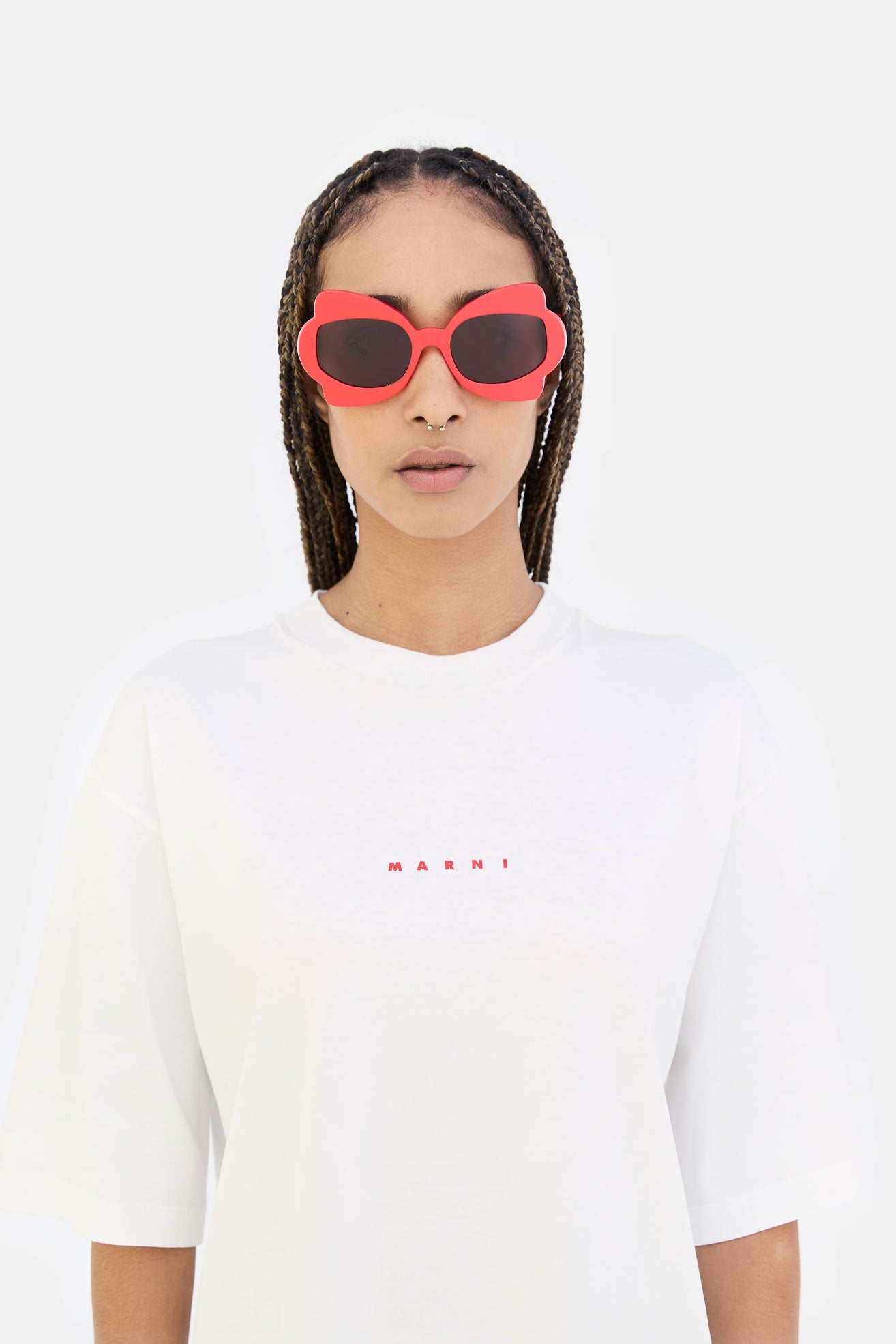 Diseñado exclusivamente para Marni, Monumental Gate es una silueta divertida inspirada en referencias florales.Su atrevida construcción en acetato presenta bordes gruesos y curvos que han sido fresados para formar un diseño redondeado y voluminoso.Las patillas únicas complementan la pieza frontal con un elemento escultórico puntiagudo que lleva un logotipo de Marni grabado con láser.Esta versión presenta un llamativo acetato rojo y lentes negras con adornos dorados.