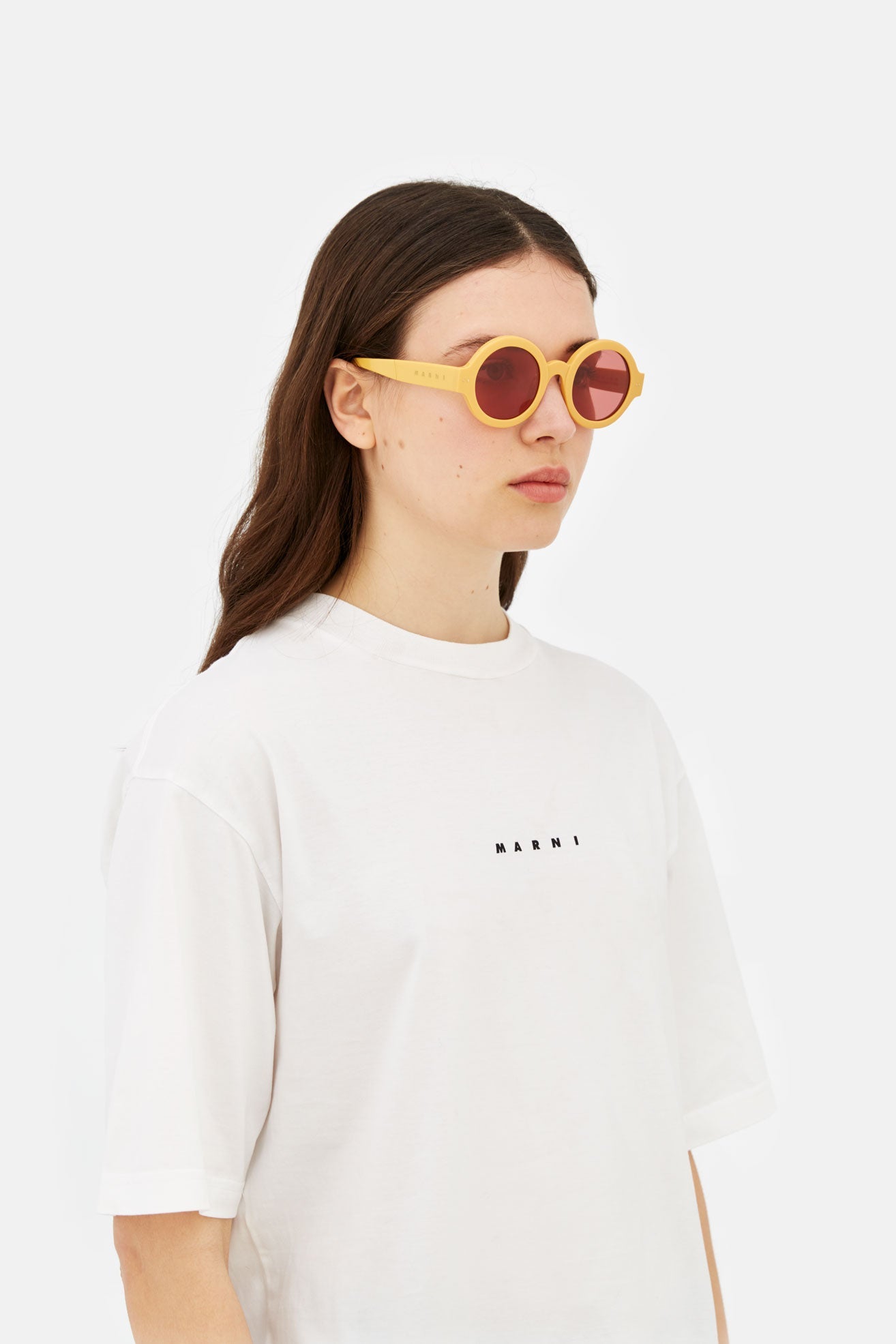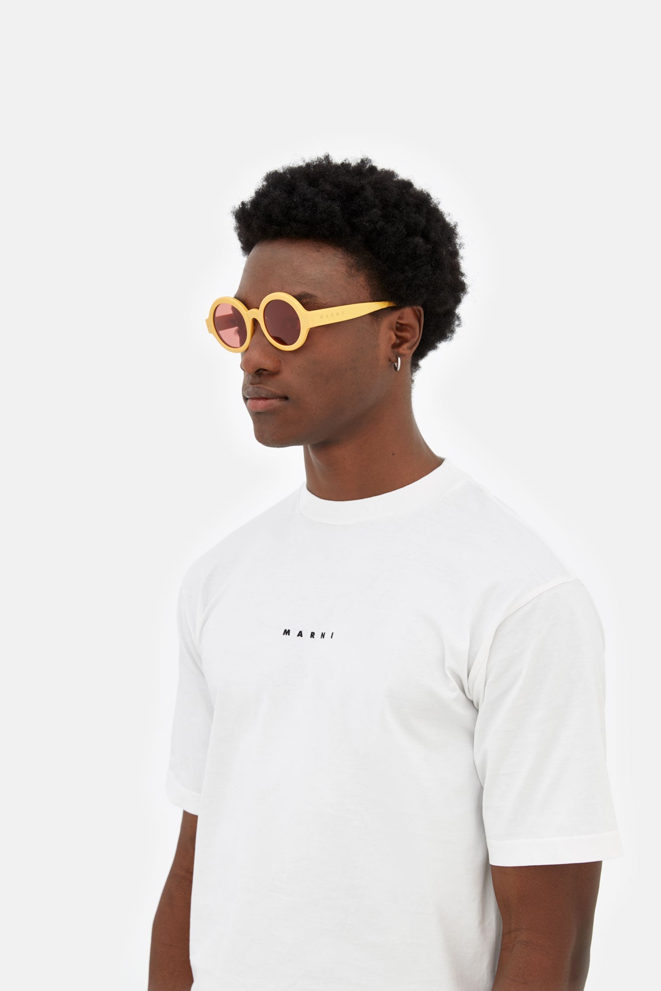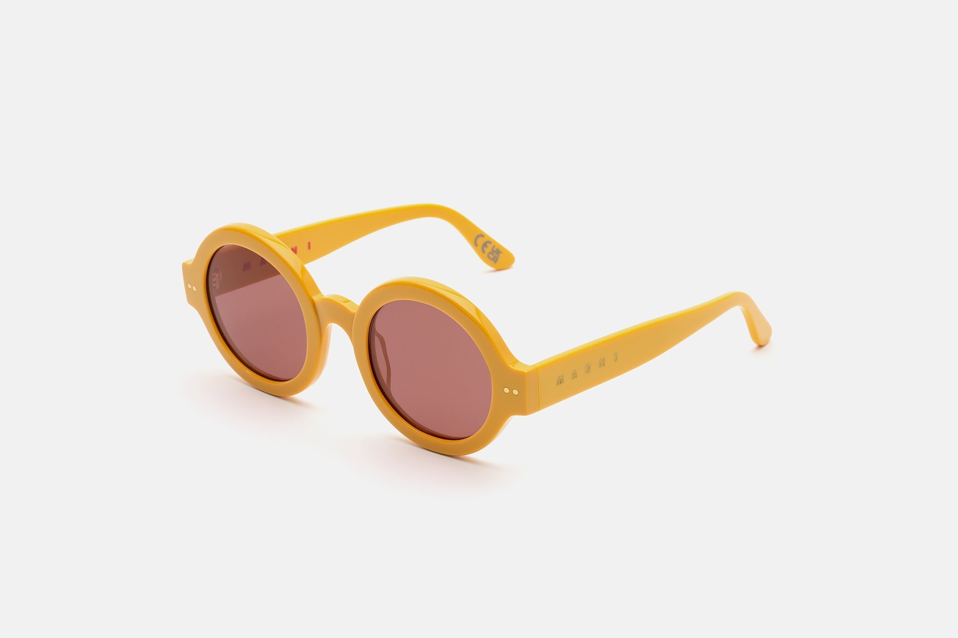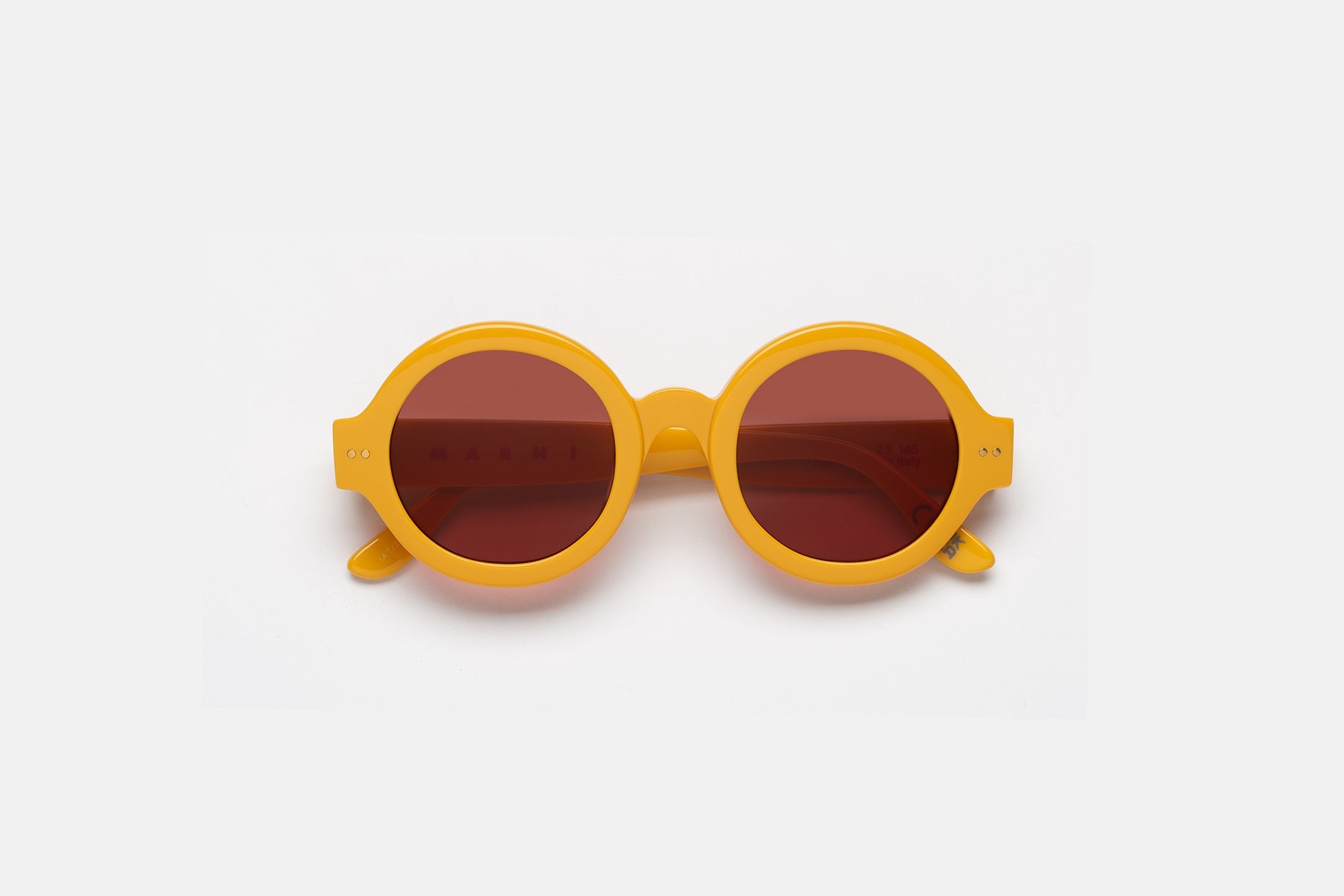 Diseñadas en exclusiva para Marni, las Nakagin Tower son una silueta lúdica que ensalza la histórica forma redonda. El modelo presenta lentes redondeadas dentro de gruesos aros con un puente curvado y patillas robustas. Un icono modernista revisitado para una estética más fresca y contemporánea. Esta versión está disponible en un relajante acetato amarillo miel con lentes tintadas en burdeos.