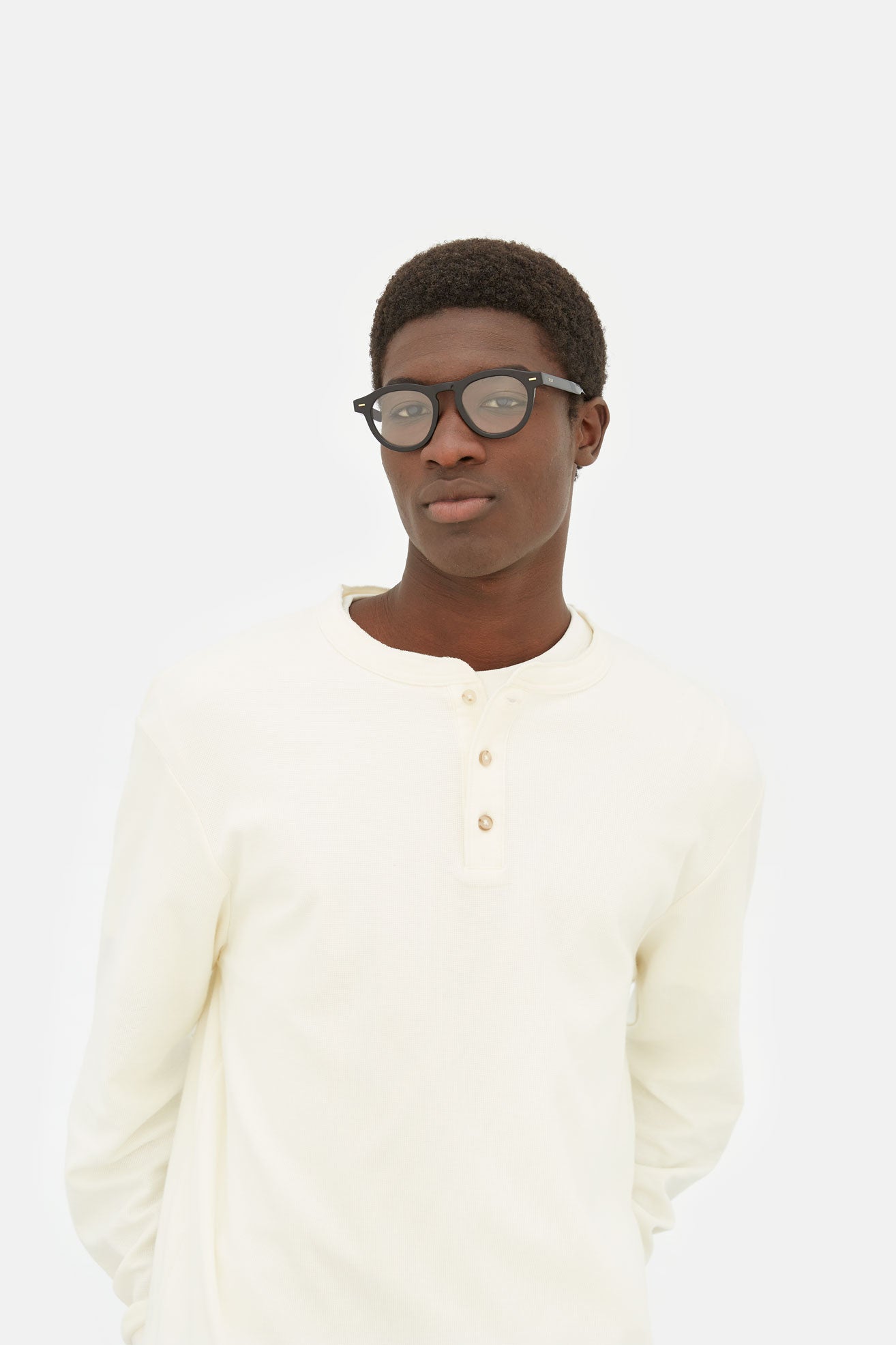 Numero 102 es una silueta redondeada, juguetona y desenfadada, diseñada para llevarla todo el día, todos los días. Se caracteriza por su diseño de puente nasal más alto y cómodo y por los robustos aros de acetato característicos de RSF. Esta forma es una versión ligeramente más grande de los modelos redondos conocidos: una reinterpretación de las monturas clásicas más ajustadas. Para potenciar su carácter, Numero 102 se ha equipado con sofisticadas tachuelas metálicas geométricas y patillas lineales. Esta versión se presenta en acetato negro.