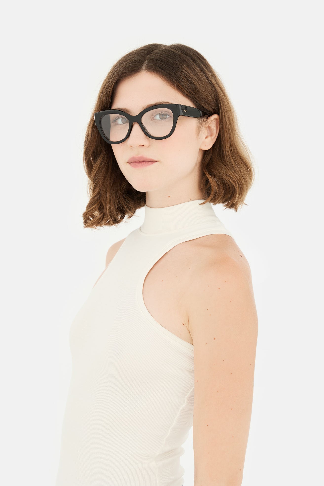 Numero 126 presenta un diseño audaz y de ojo de gato de gran tamaño. El diseño presenta una silueta distintiva con bordes redondeados y bordes esculpidos, creando una estética divertida y moderna para un uso versátil. Disponible en un acetato negro brillante atemporal y lentes transparentes. Hecho a mano en Italia.