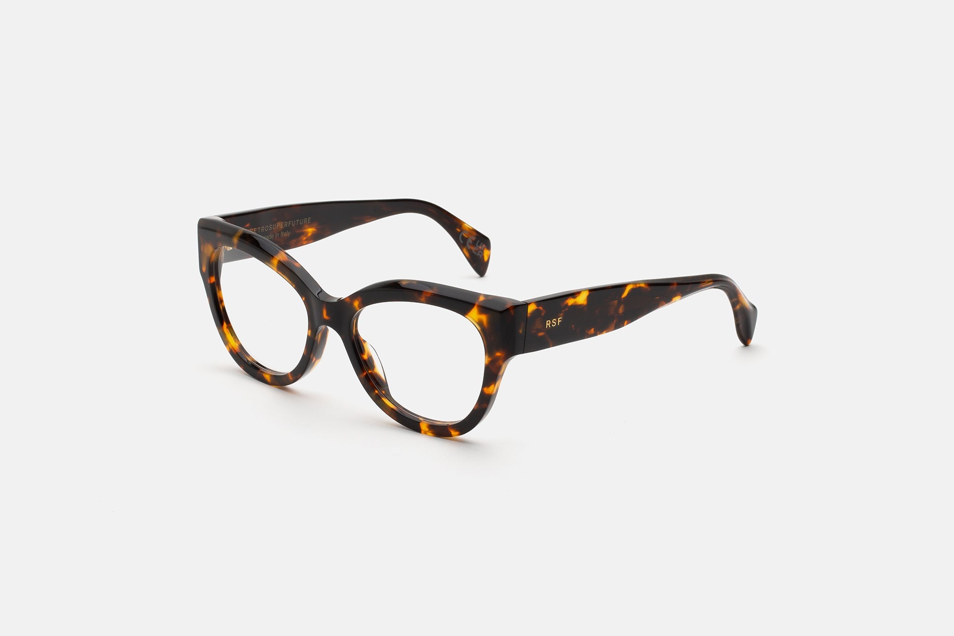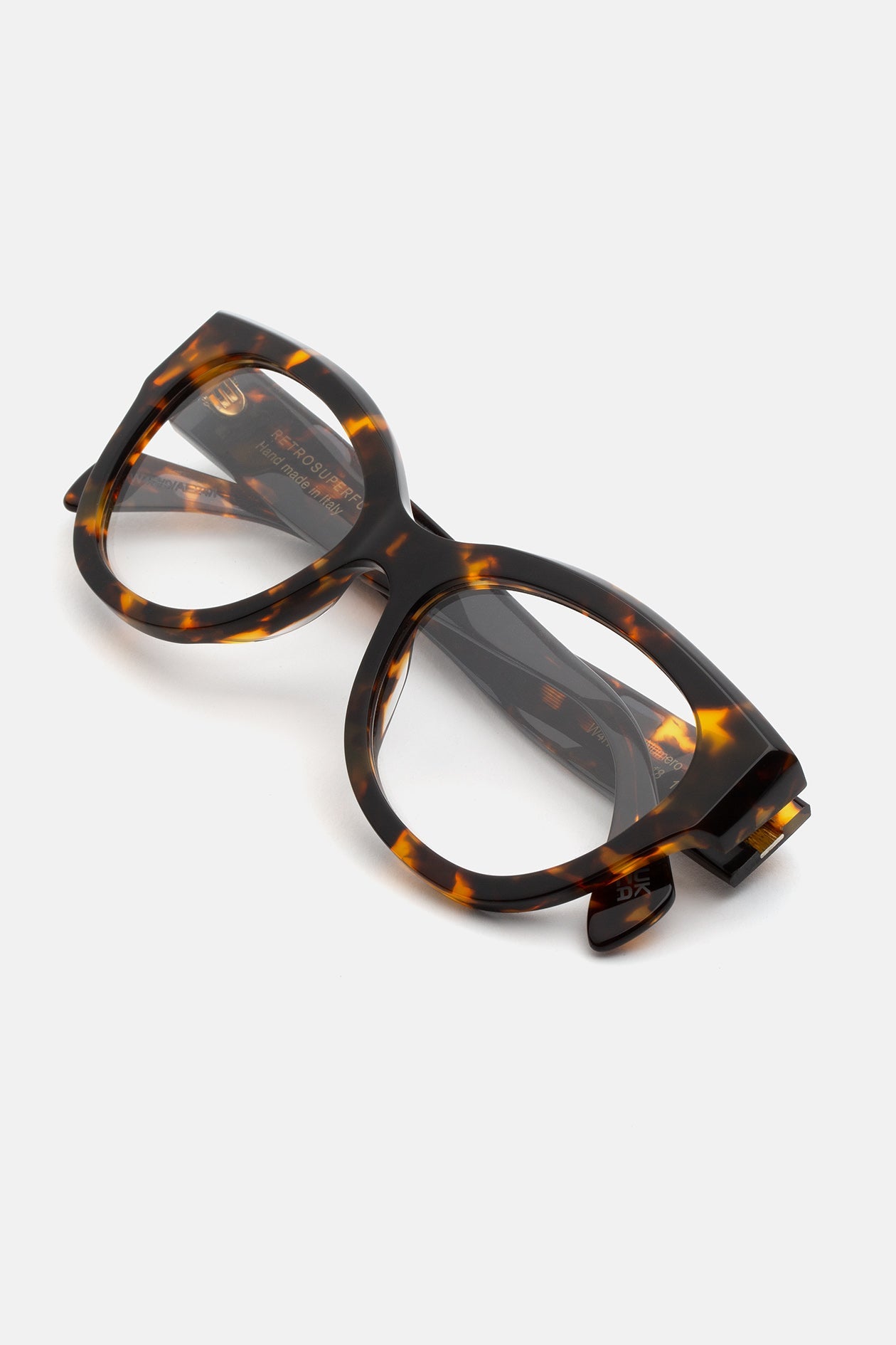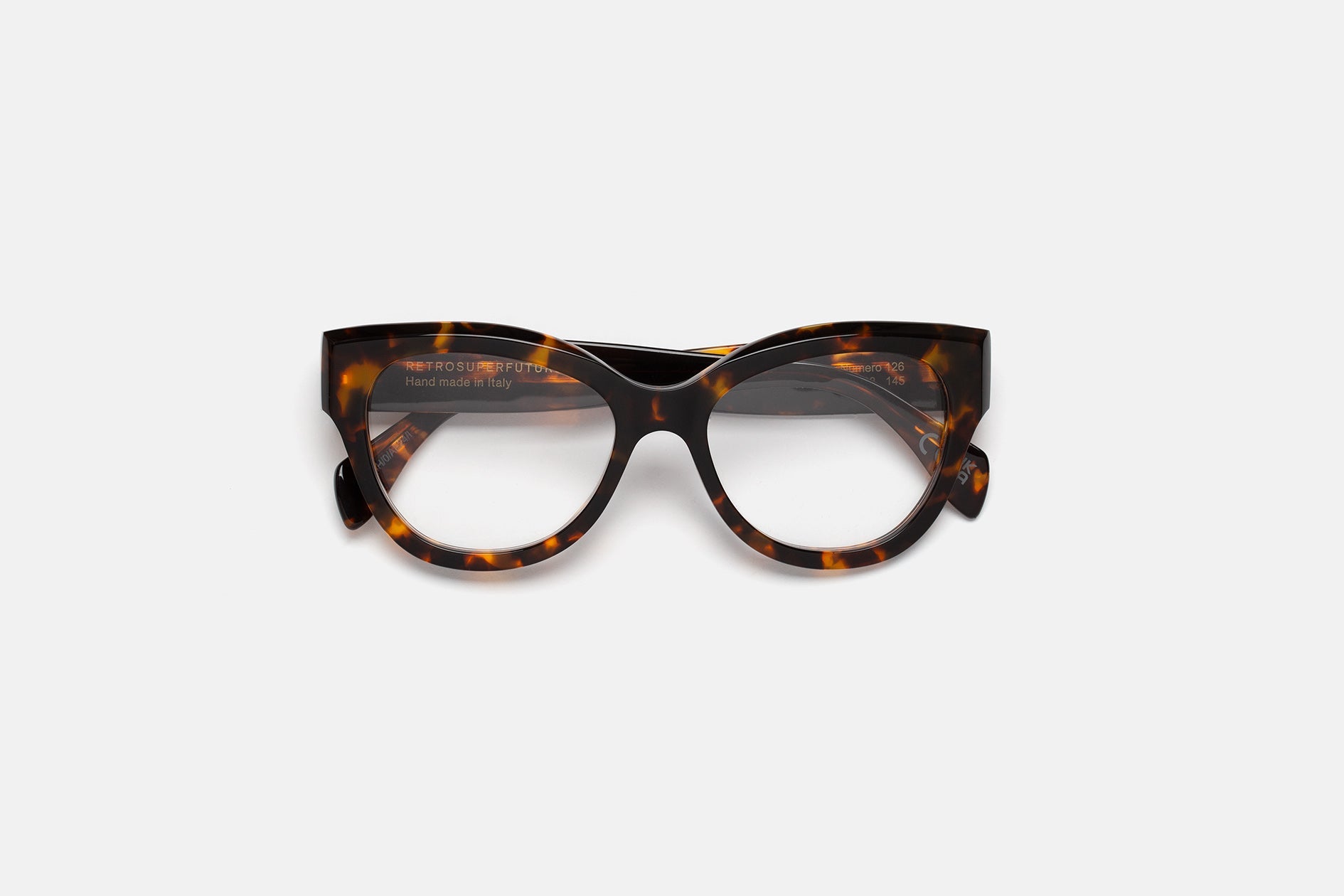 Numero 126 presenta un diseño audaz y de ojo de gato de gran tamaño. El diseño presenta una silueta distintiva con bordes redondeados y bordes esculpidos, creando una estética divertida y moderna para un uso versátil. Disponible en un acetato de tortuga único y rico y lentes transparentes. Hecho a mano en Italia.