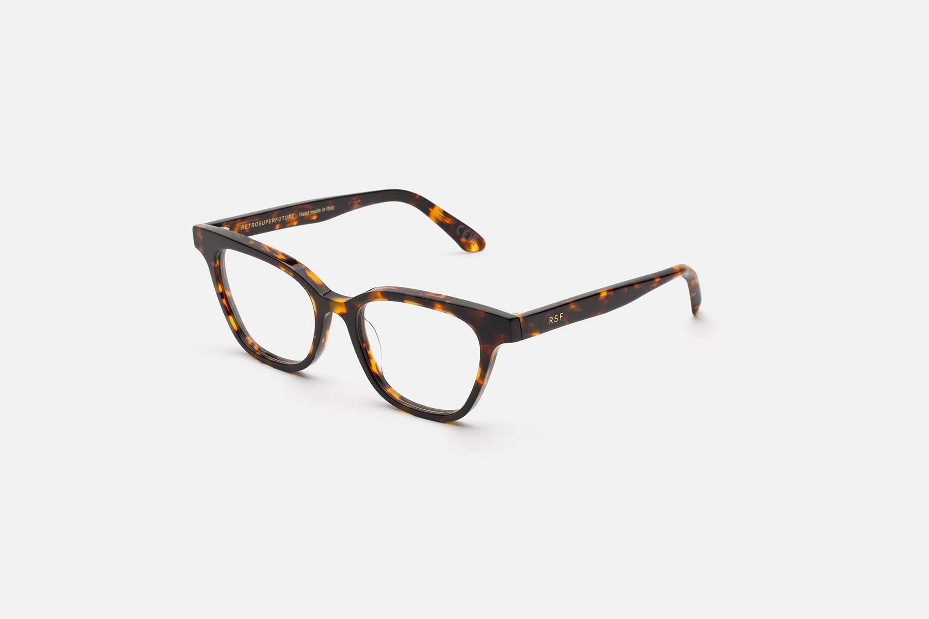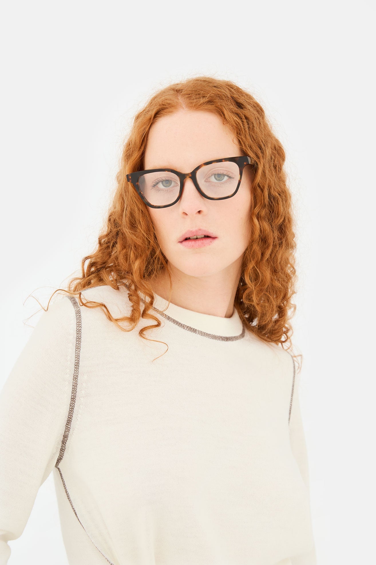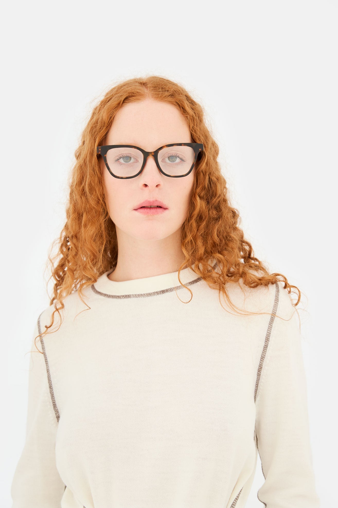 Acetato italiano de alta calidad en un intenso acetato Havana. Lentes transparentes de montaje en base 4. Lentes graduadas no incluidas. Gafas de alta gama diseñadas en Milán, Italia.