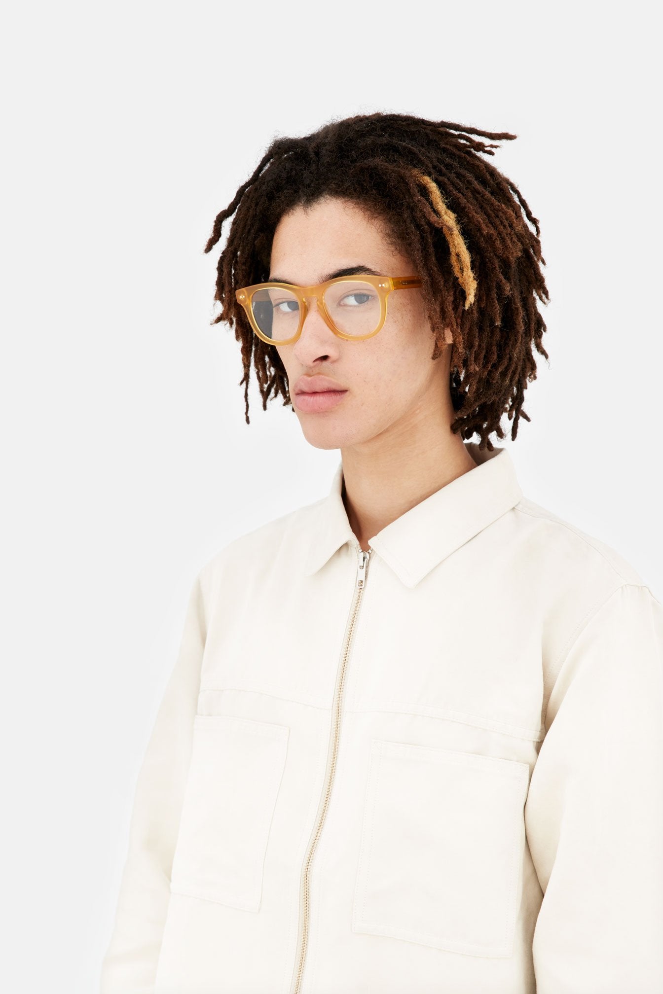Curvas precisas y detalles funcionales definen esta atrevida montura, con bordes gruesos, una línea superior curva y un puente nasal con forma de ojo de cerradura para el uso diario. Este modelo viene con un acetato tipo cristal teñido de ámbar. Lentes con graduación no incluidos.