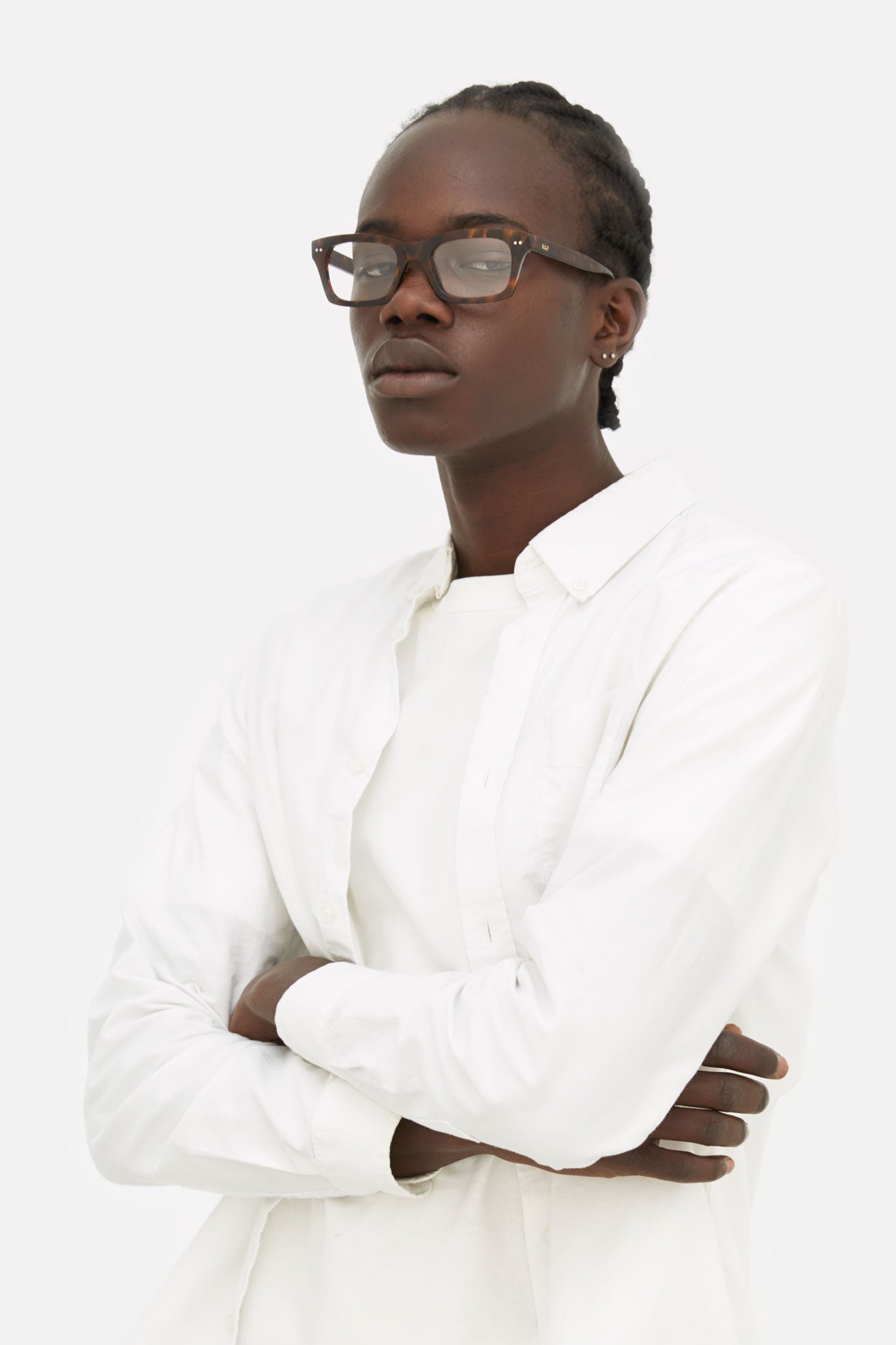 Numero 95 es una pieza esencial de gafas concebida como un elemento básico para el día a día, pero con un marcado carácter callejero. Su montura maciza cuidadosamente tallada, con una cómoda montura nasal y robustos bordes de acetato, permite que esta forma sea adecuada tanto para un estilo cotidiano más formal como para un enfoque urbano informal. Este modelo se presenta con un frente de cristal azul marino mate y patillas de color habano mate.