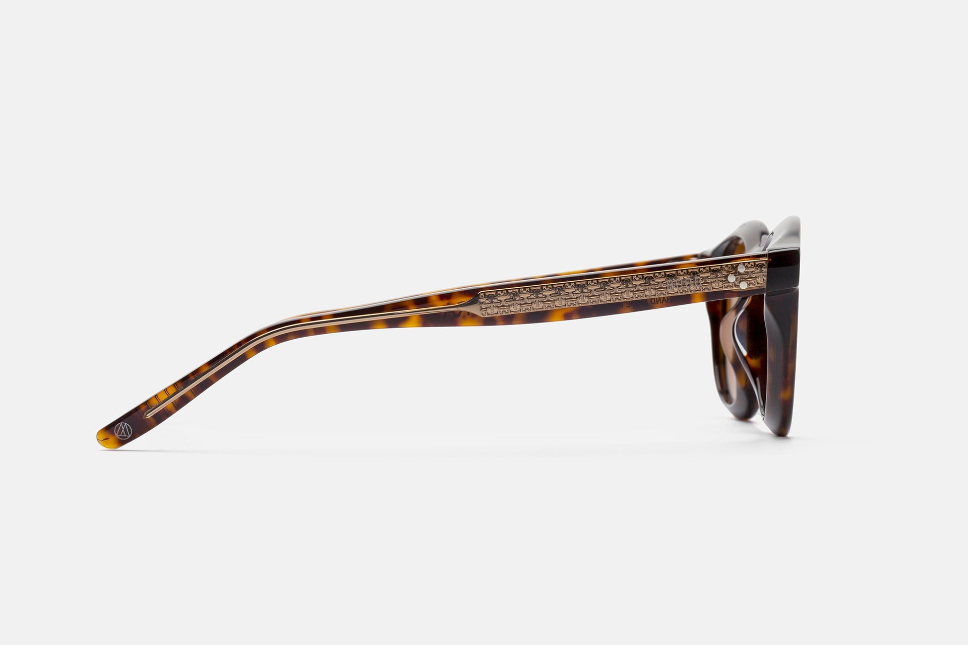 Una pieza atemporal de gafas diseñada para Ottomila, una marca de alta gama conocida por su meticuloso enfoque del diseño y la artesanía. Ombra es una reinterpretación contemporánea de las siluetas clásicas de los años 50, caracterizada por un puente nasal en forma de ojo de cerradura y lentes redondeadas. Sus bordes curvados se han fabricado con acetato italiano grueso y robusto, y se han tallado en los laterales para revelar unos bordes precisos y geométricos. Un minucioso trabajo de metal y unas inscripciones completan la pieza. Esta versión se presenta con lentes ahumadas de color volcánico y un vibrante acetato semitransparente de color verde oscuro. Este efecto translúcido resalta el núcleo metálico personalizado con la decoración de Frank Lloyd Wright en las patillas.