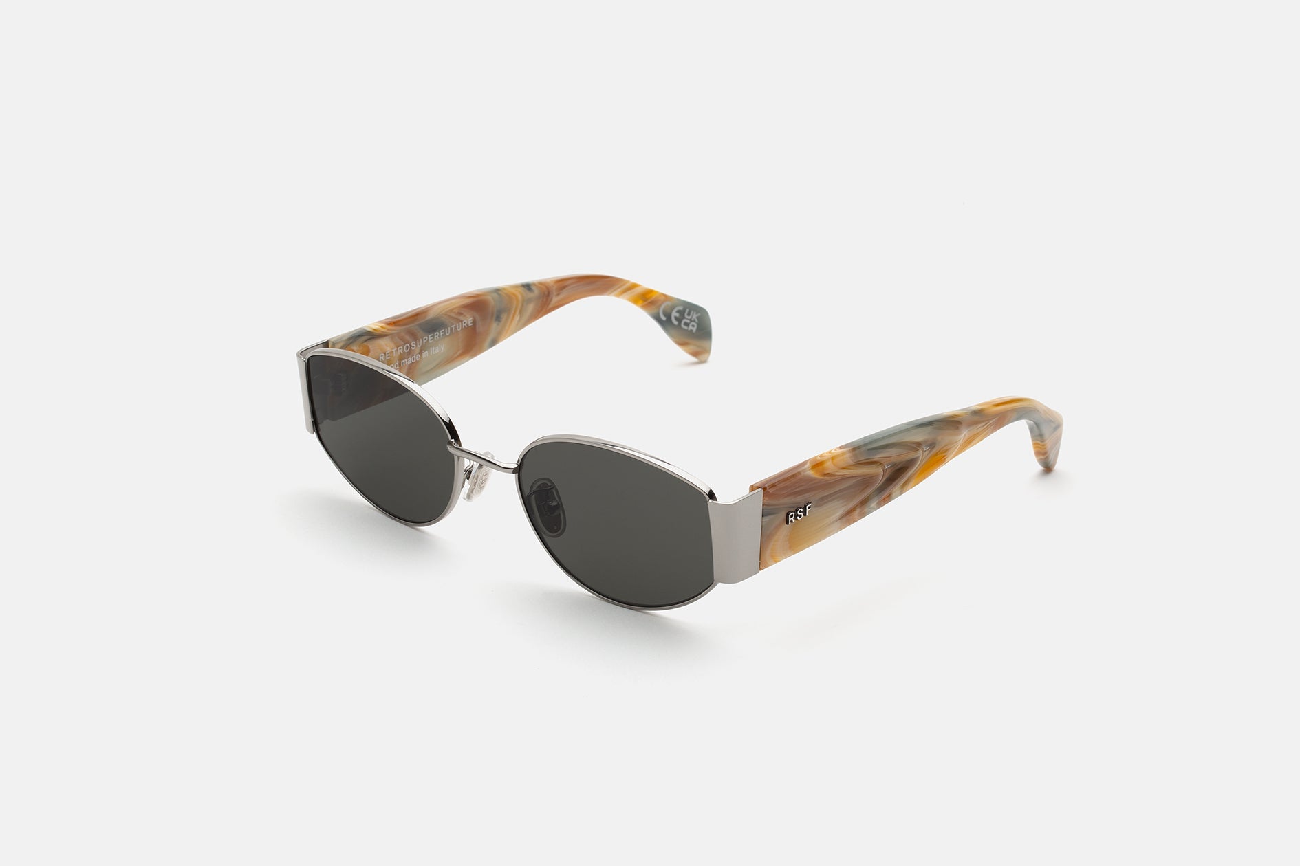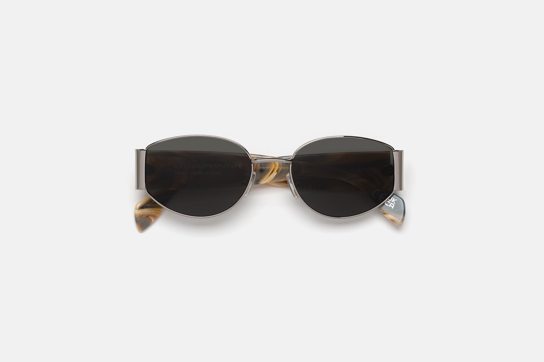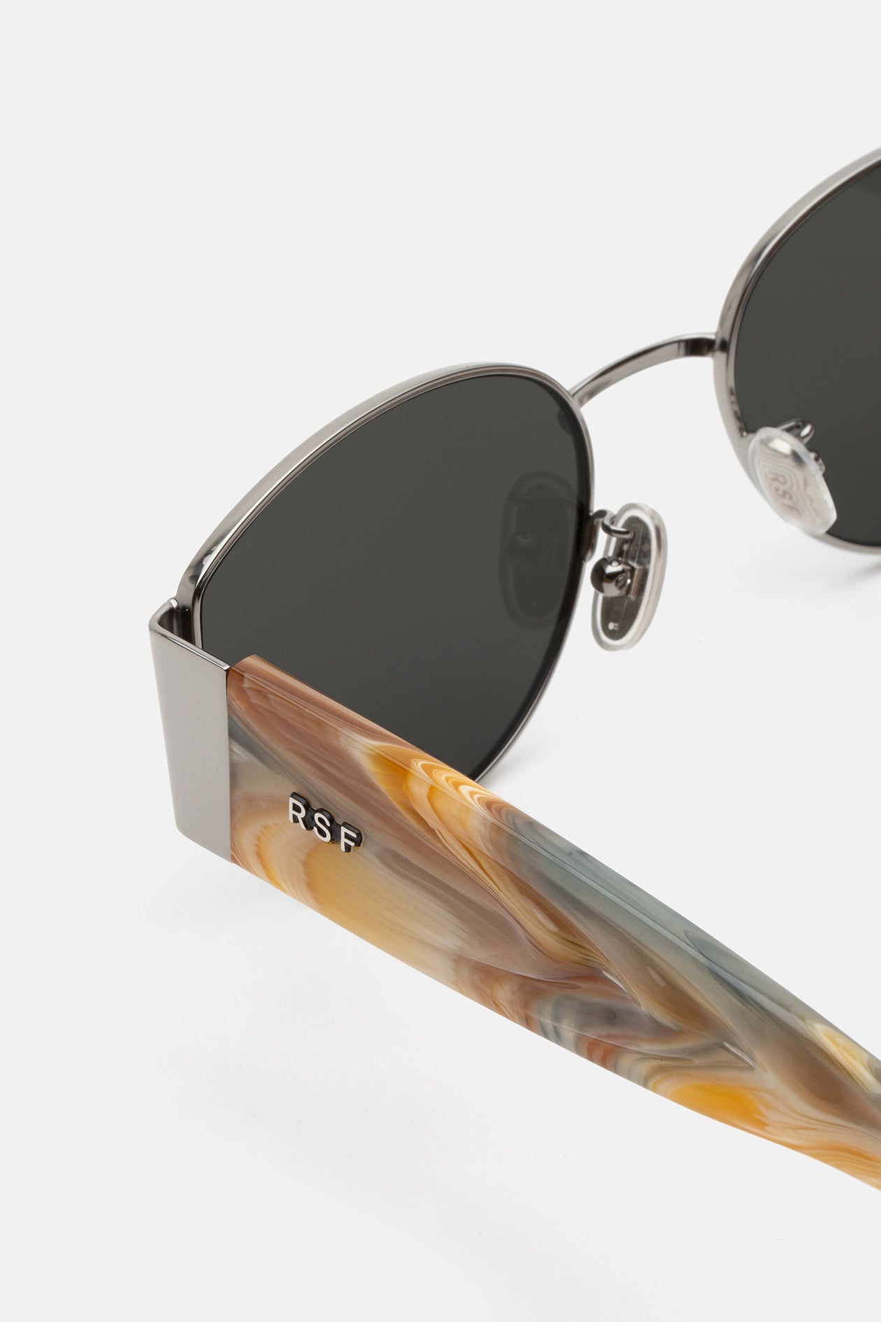 Metal plateado brillante de alta calidad y acetato italiano en un patrón jaspeado intenso y psicodélico. Montura de lentes Zeiss extra black en base 2. Gafas de primera calidad hechas a mano en Italia.